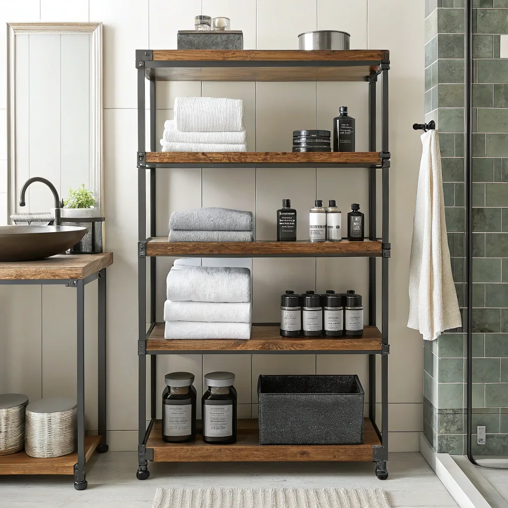 Strategic open shelving displays premium grooming products, rolled towels in monochromatic palettes, or curated objects earning their placement through aesthetic merit or personal significance. Floating shelves in wood, metal, or glass maintain visual lightness while providing functional storage.